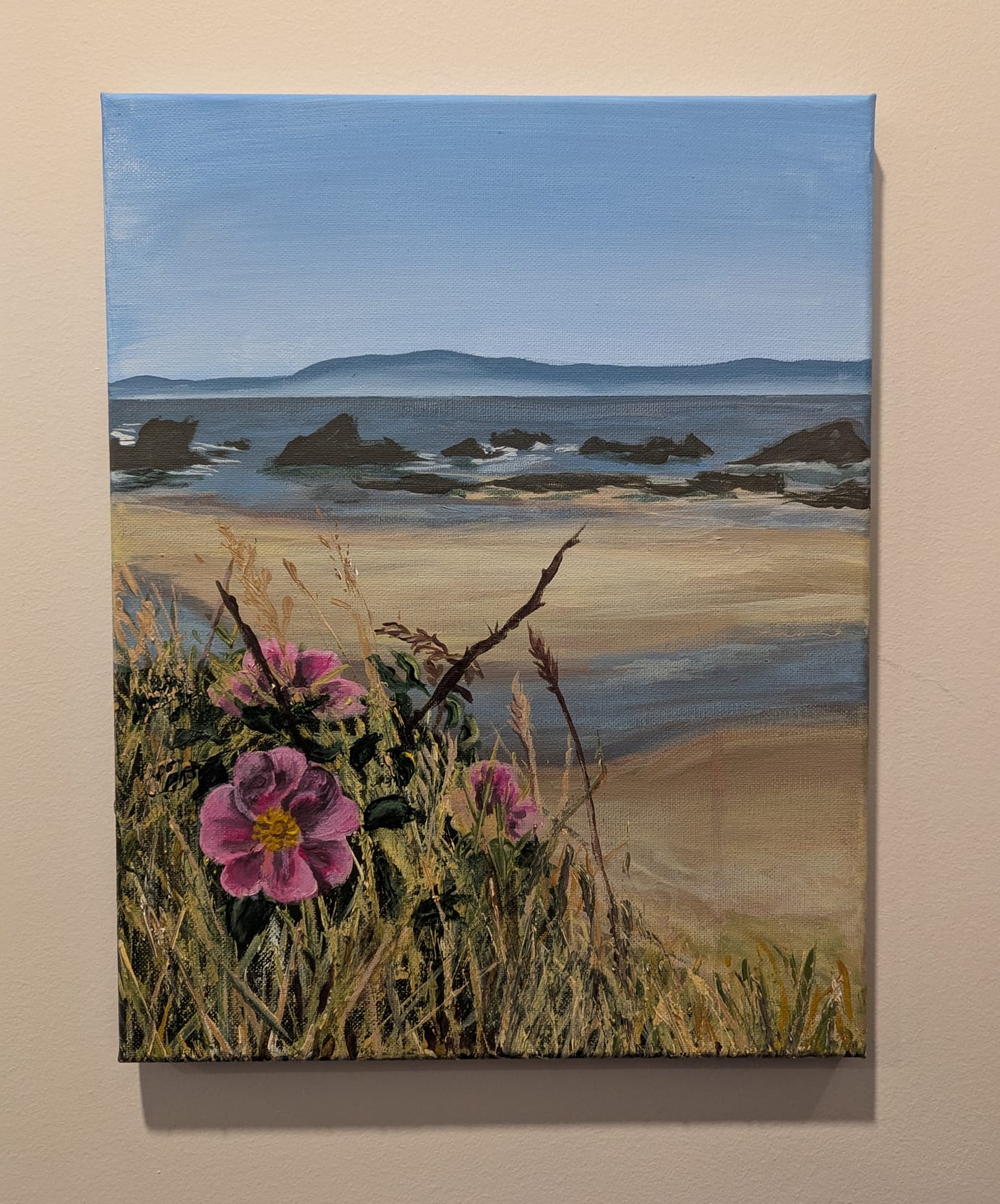 This landscape painting captures the quiet beauty of a coastal scene where wild cosmos bloom along sandy dunes, set against a backdrop of tidal pools and distant mountains. Painted in a realist style with soft impressionistic brushwork in the foreground flora, the piece evokes a serene, contemplative mood. The artist uses natural lighting and atmospheric perspective to convey depth and the gentle movement of wind and water. This work reflects a deep appreciation for the untamed harmony found where land meets sea.